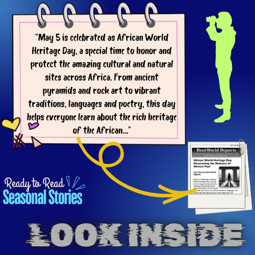 Explore the beauty, history, and cultural richness of Africa with this engaging article package designed for young learners aged 8 and up. Centered on African World Heritage Day (May 5), this resource highlights the importance of protecting and celebrating Africa’s cultural and natural wonders. From ancient sites like Timbuktu to breathtaking landscapes like Mount Kilimanjaro, this reading pack introduces students to the stories behind Africa’s heritage.