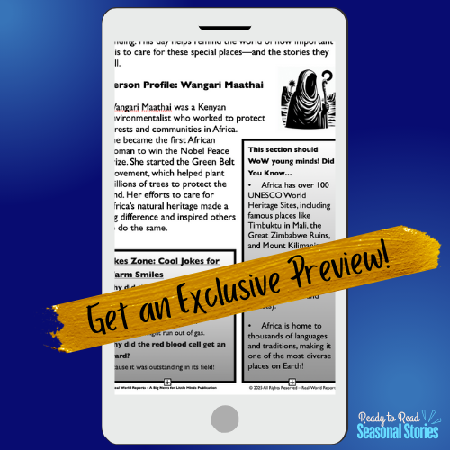 The story of Wangari Maathai, fun trivia, a stamp-making activity, and cheerful jokes create a well-rounded resource perfect for cultural awareness lessons or global citizenship discussions.