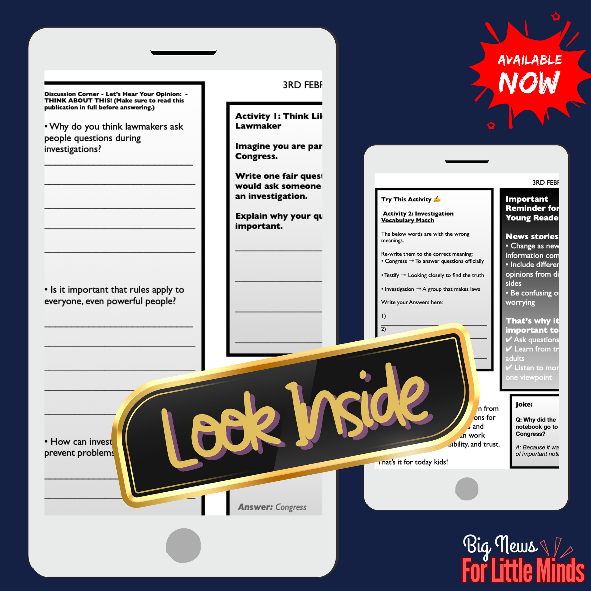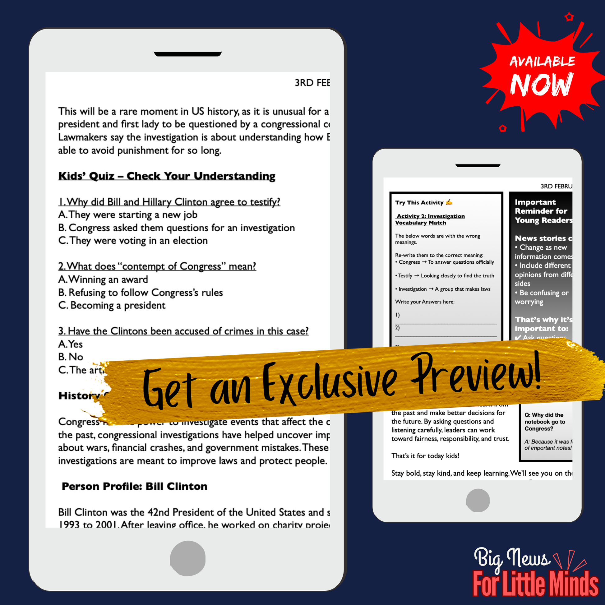 This Kids News Newspaper–style article package explains a complex political investigation in a calm, factual, and age-appropriate way. It presents a,neutral summary explaining why Bill and Hillary Clinton agreed to testify in the Epstein investigations. It helps young readers understand how Congressional investigations work, why testimony matters, and how accountability applies to everyone — without focusing on graphic or inappropriate details.