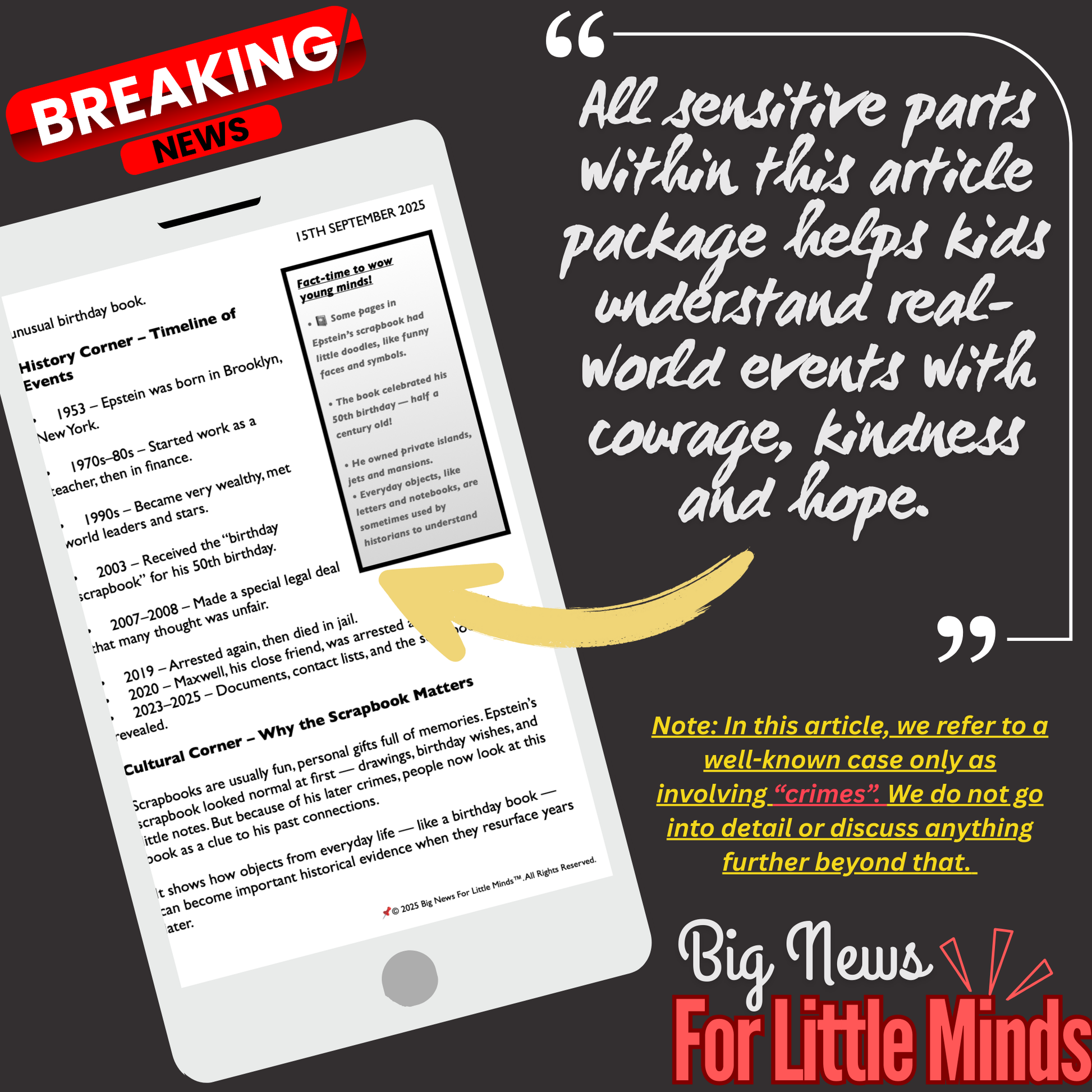 This article package introduces children aged 8+ to the story of Jeffrey Epstein, his crimes, and the unusual “mystery birthday book” discovered years later. Written in clear, age-appropriate language, it explains who Epstein was, what happened in his case, and why something as ordinary as a scrapbook became important evidence. The package mixes serious history with lighter learning activities, helping children understand how everyday objects can turn into clues about the past. Note: In this article, we refer to a well-known case only as involving "crimes". We do not go into detail or discuss anything further beyond that, the word "crime".