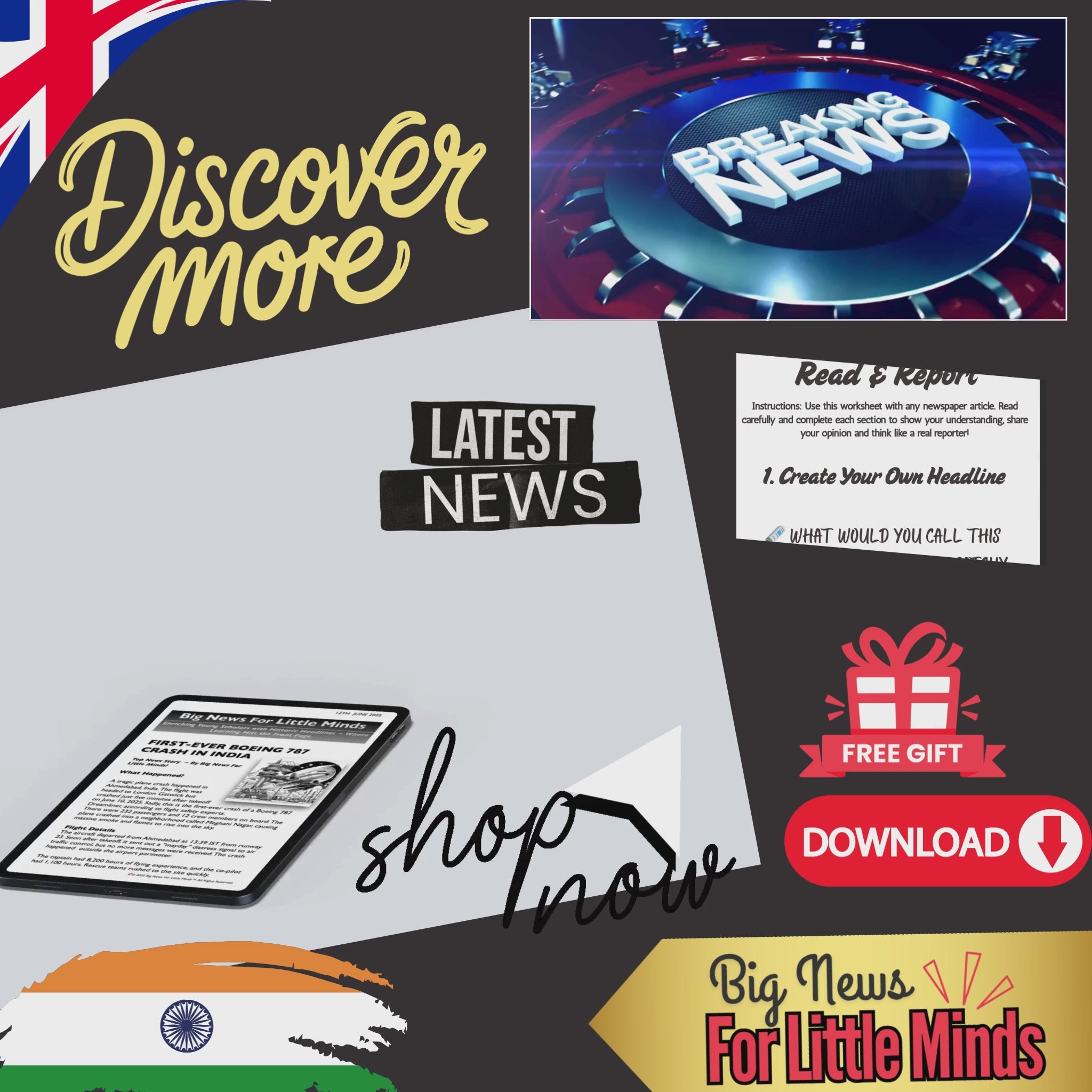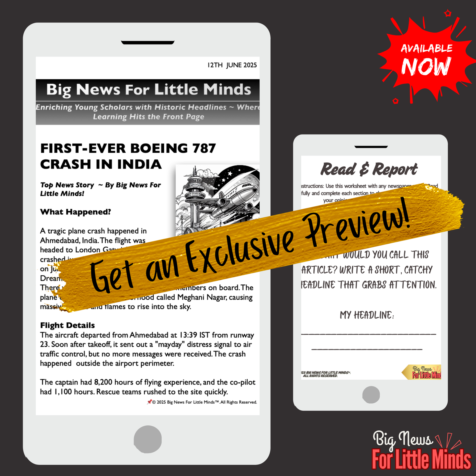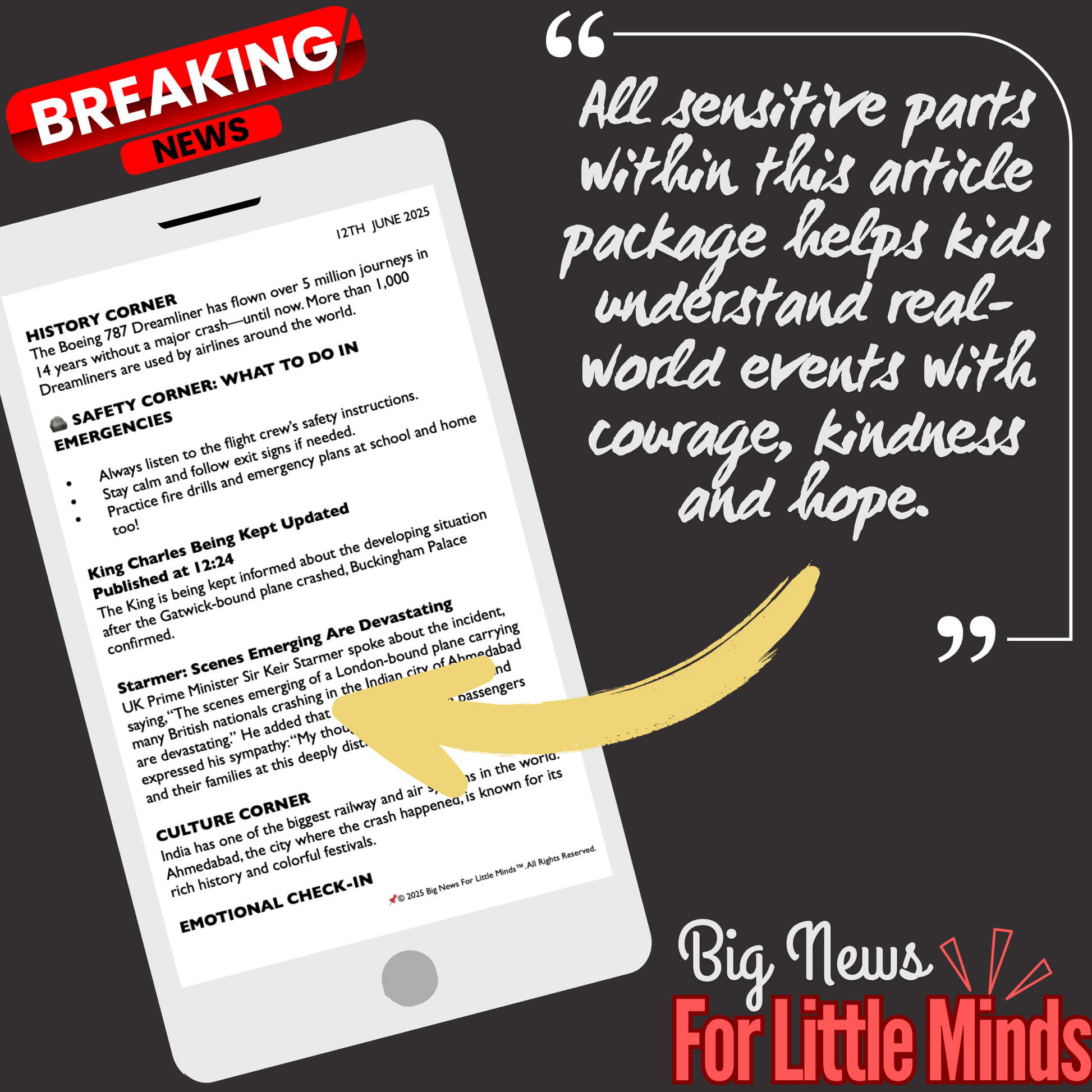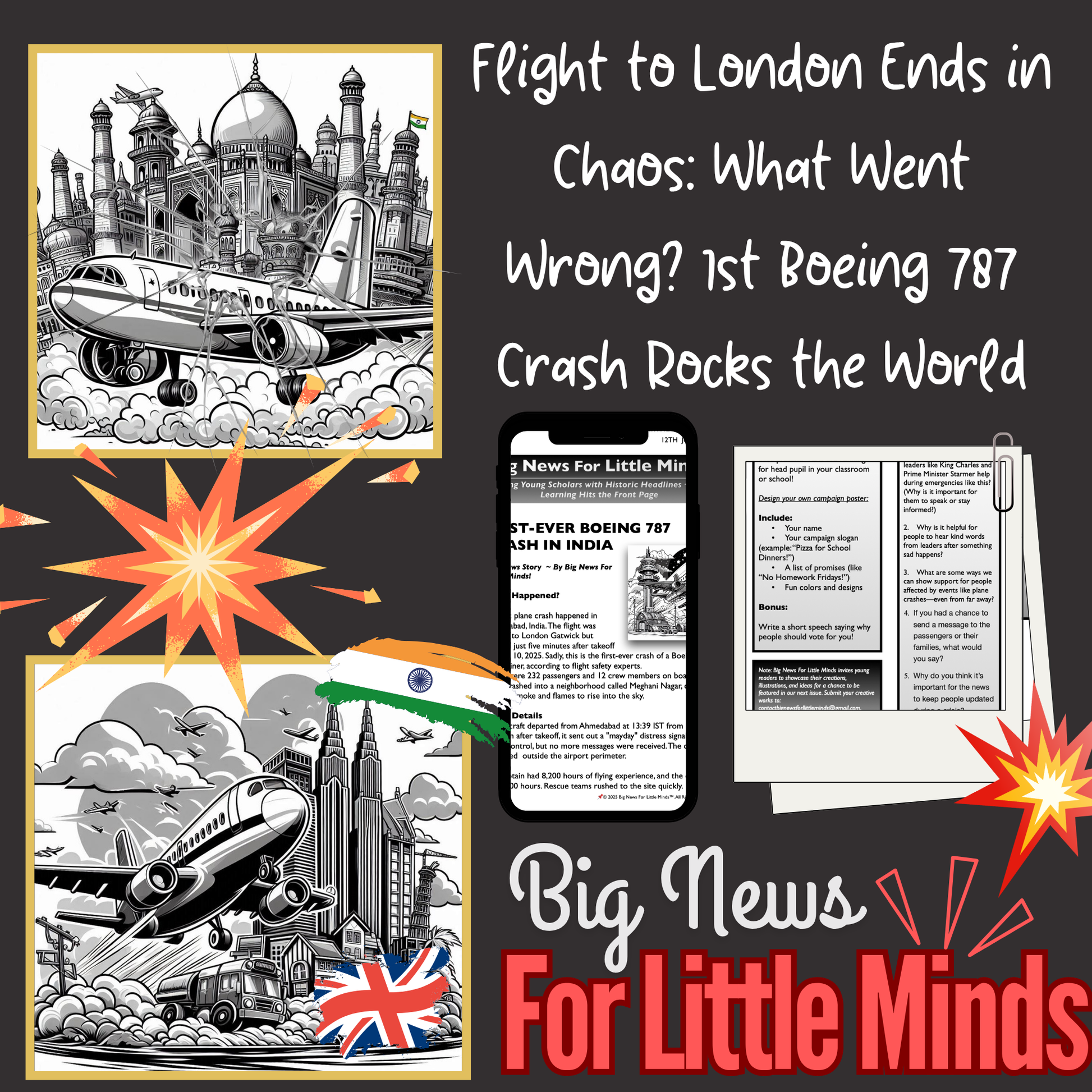 Help young readers understand and process tragic world events with this sensitive and age-appropriate article about the 2025 Ahmedabad plane crash en route to London, England (the Air India Flight AI171 disaster and tragedy involving a Boeing 787 Dreamliner) . This edition of Big News for Little Minds™ covers what happened, who was involved, and how communities respond during emergencies—with clarity, compassion, and a focus on safety and empathy.