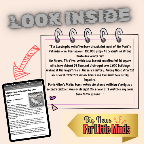 This article package brings the California, Los Angeles wildfires to life for young learners, showcasing the devastation caused by the fires while highlighting resilience and courage in the face of adversity. Tailored for kids aged 8+, it provides a comprehensive overview with engaging activities, fun facts and a creative approach to understanding real-life disasters.