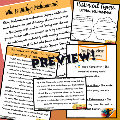 This engaging nonfiction reading introduces students to Ibtihaj Muhammad, an Olympic athlete who made history through skill, determination, and representation. Learners explore her journey in the sport of fencing, the significance of her appearance at the 2016 Olympic Games, and how her achievements inspired millions of young people around the world.