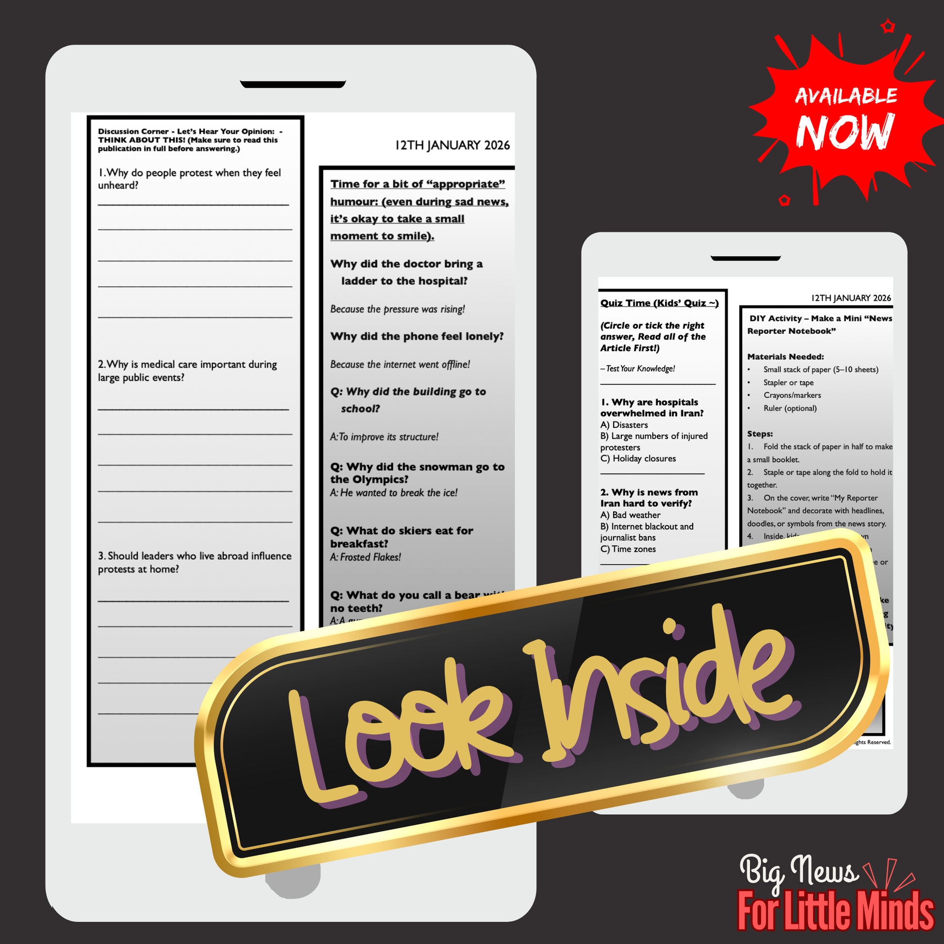 This child-friendly current events article package explores the 2026 anti-government protests in Iran using clear, age-appropriate language. Students learn what sparked the demonstrations, how everyday life—especially hospitals and healthcare—has been affected, and why news from Iran has been difficult to verify. The resource encourages empathy, critical thinking, and global awareness while remaining balanced and factual. Ready to teach, no prep, and suitable for upper elementary to middle grades.