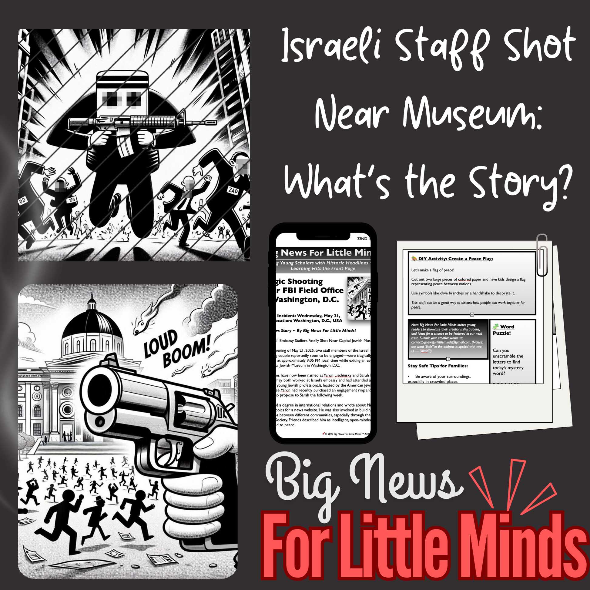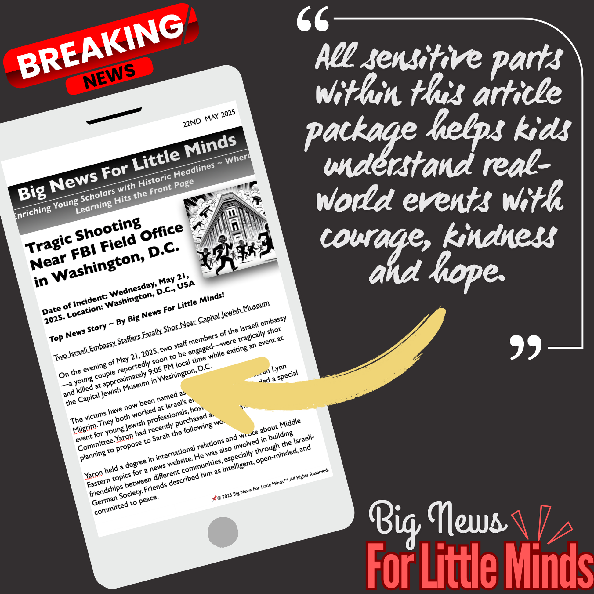 This article package shares a heartbreaking real-world event—two Israeli Embassy staffers were tragically shot near the Capital Jewish Museum in Washington, D.C., just steps away from major U.S. government buildings. With care and sensitivity, this news story explains what happened, who was involved, and why this matters, all in a tone that young readers can understand. Readers will learn about the victims’ lives, the suspected motive and the worldwide response from leaders. (Only purchase for those who are mature enough to understand this tragic event!)