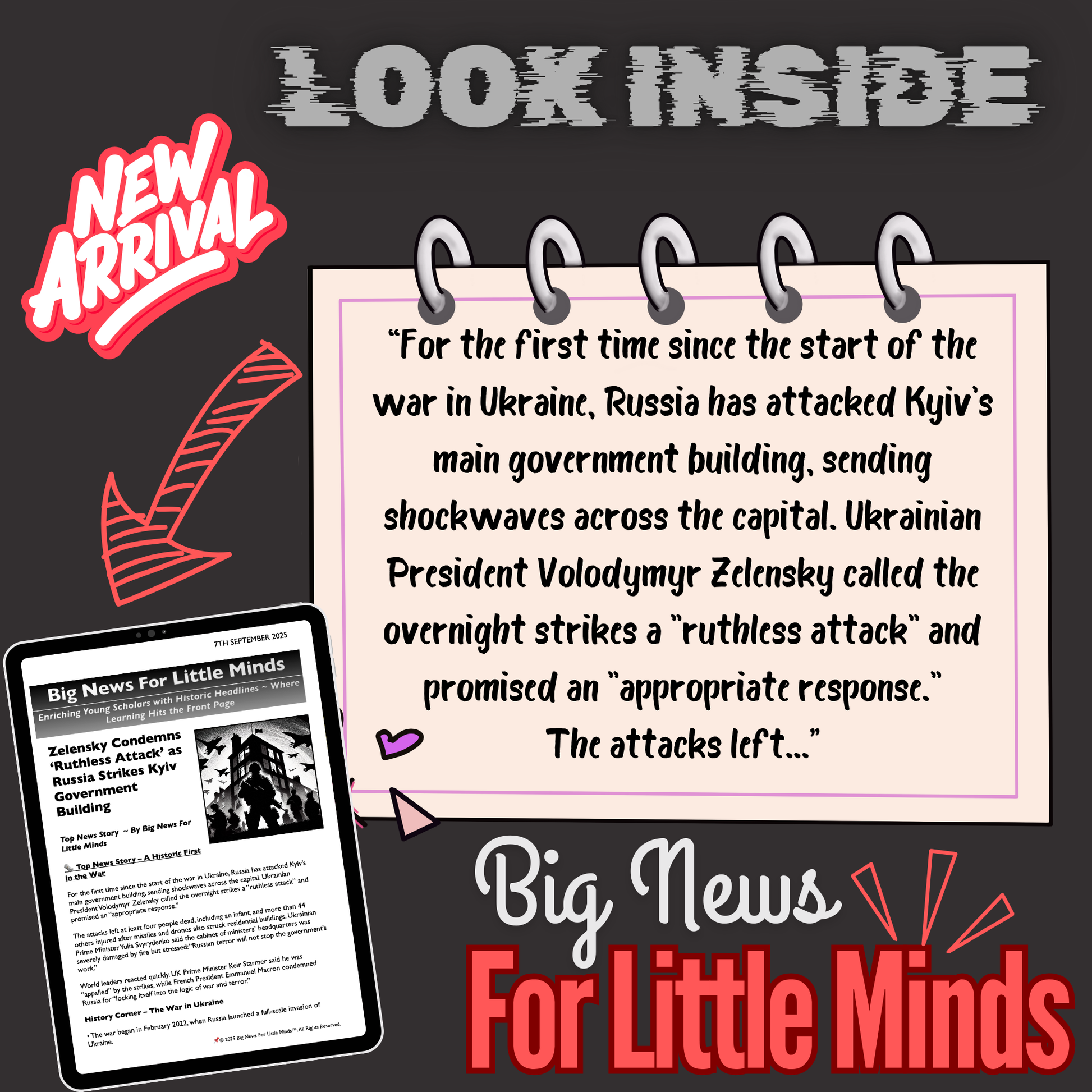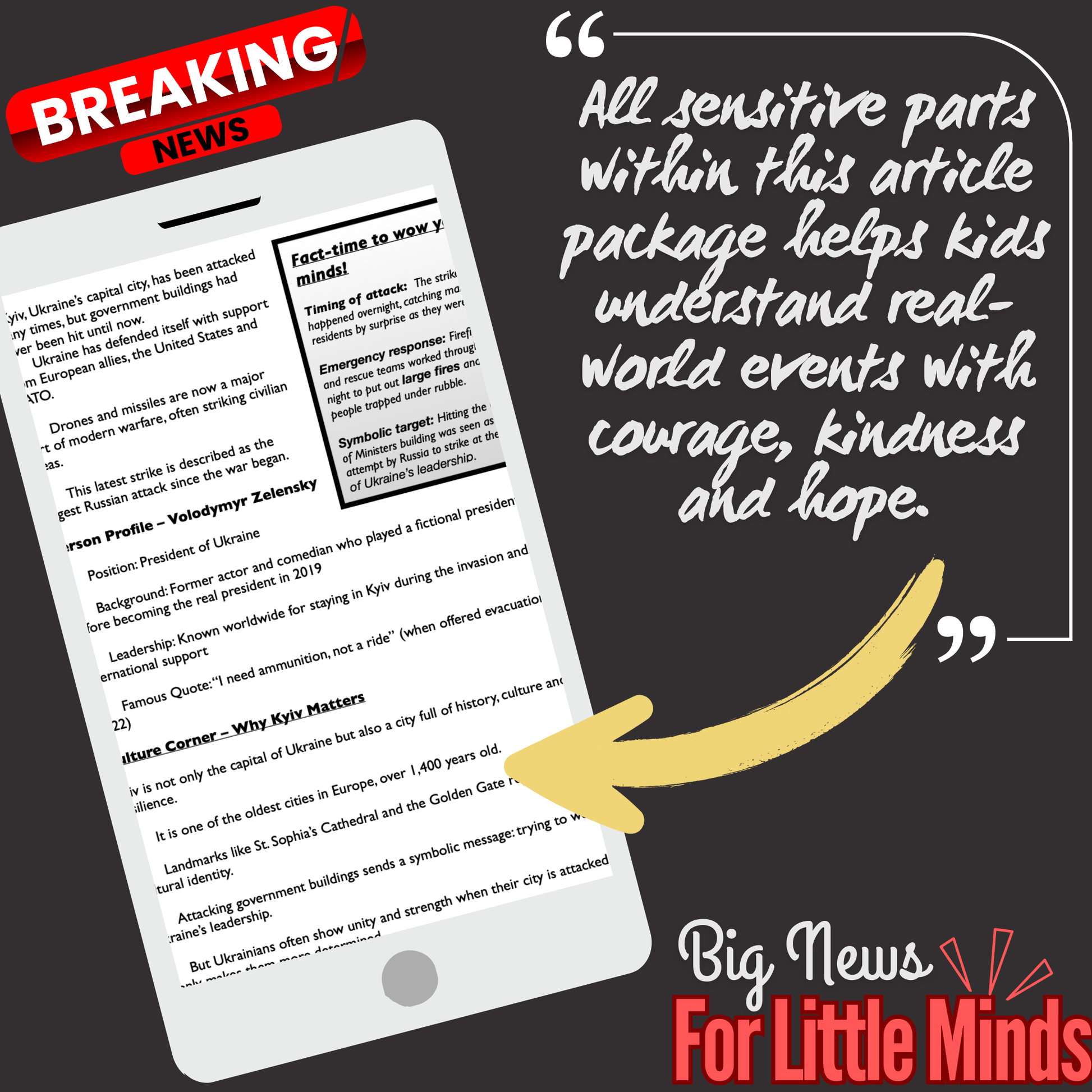 This article package introduces students aged to a historic and shocking moment in the Ukraine–Russia war: the first direct strike on Kyiv’s main government building. Kids will learn about President Volodymyr Zelensky’s response, the human cost of the attack and how a couple of world leaders reacted (UK & France). Through reading, a puzzle, a quizz, and creative activities, learners are encouraged to think critically about leadership, resilience, and the global impact of war.