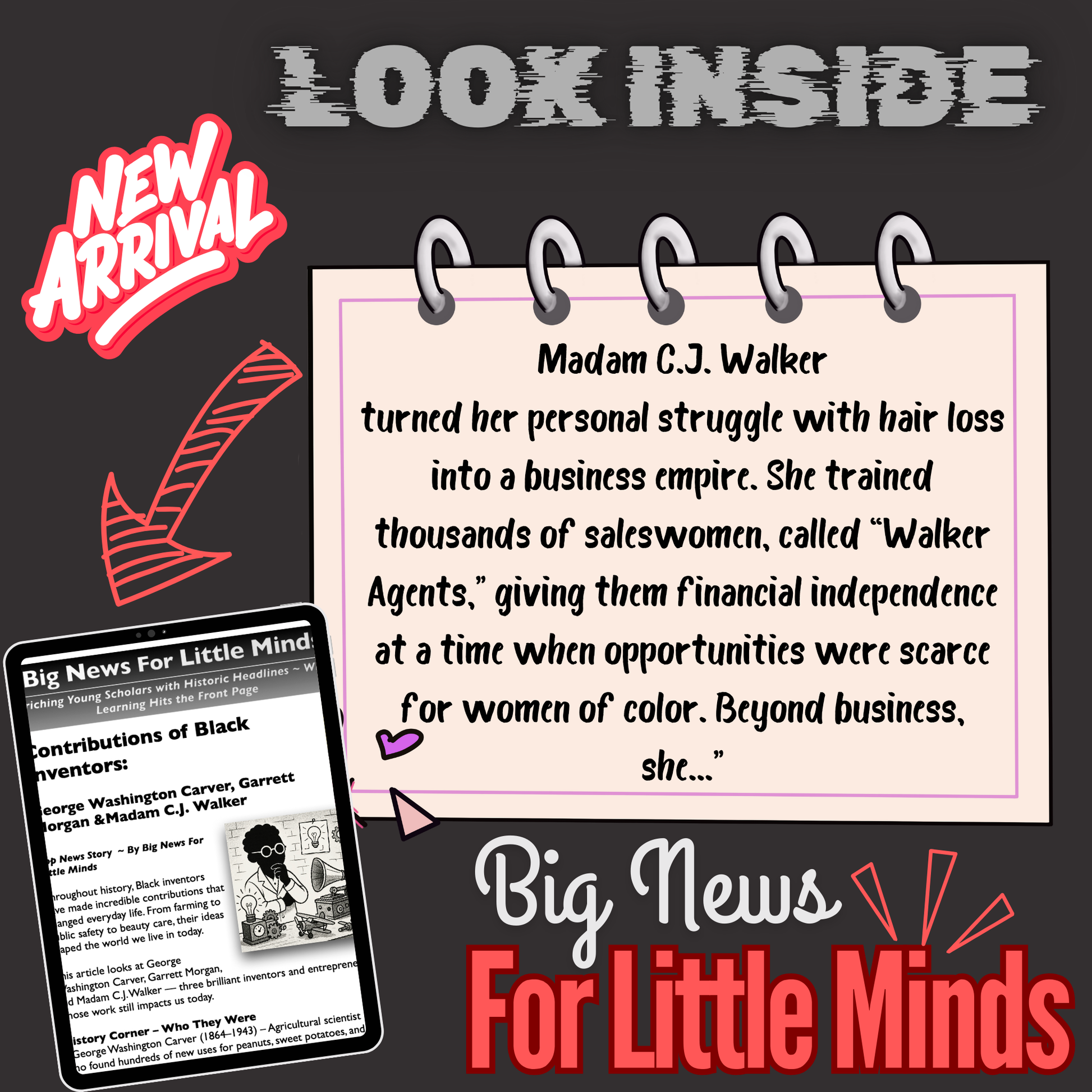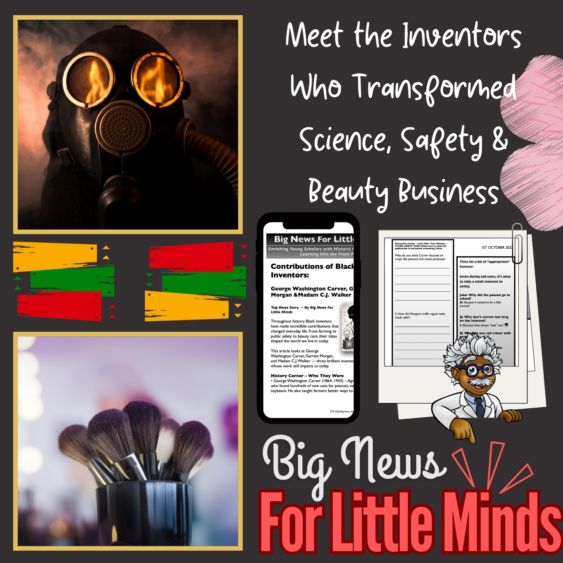 This article package introduces children aged 8+ to three groundbreaking Black inventors who changed the way we live: George Washington Carver, Garrett Morgan & Madam C.J. Walker. Carver revolutionized farming through crop rotation and peanut-based products, Morgan’s traffic signal and safety hood improved public safety, and Walker became one of the first self-made female millionaires while empowering thousands of women.