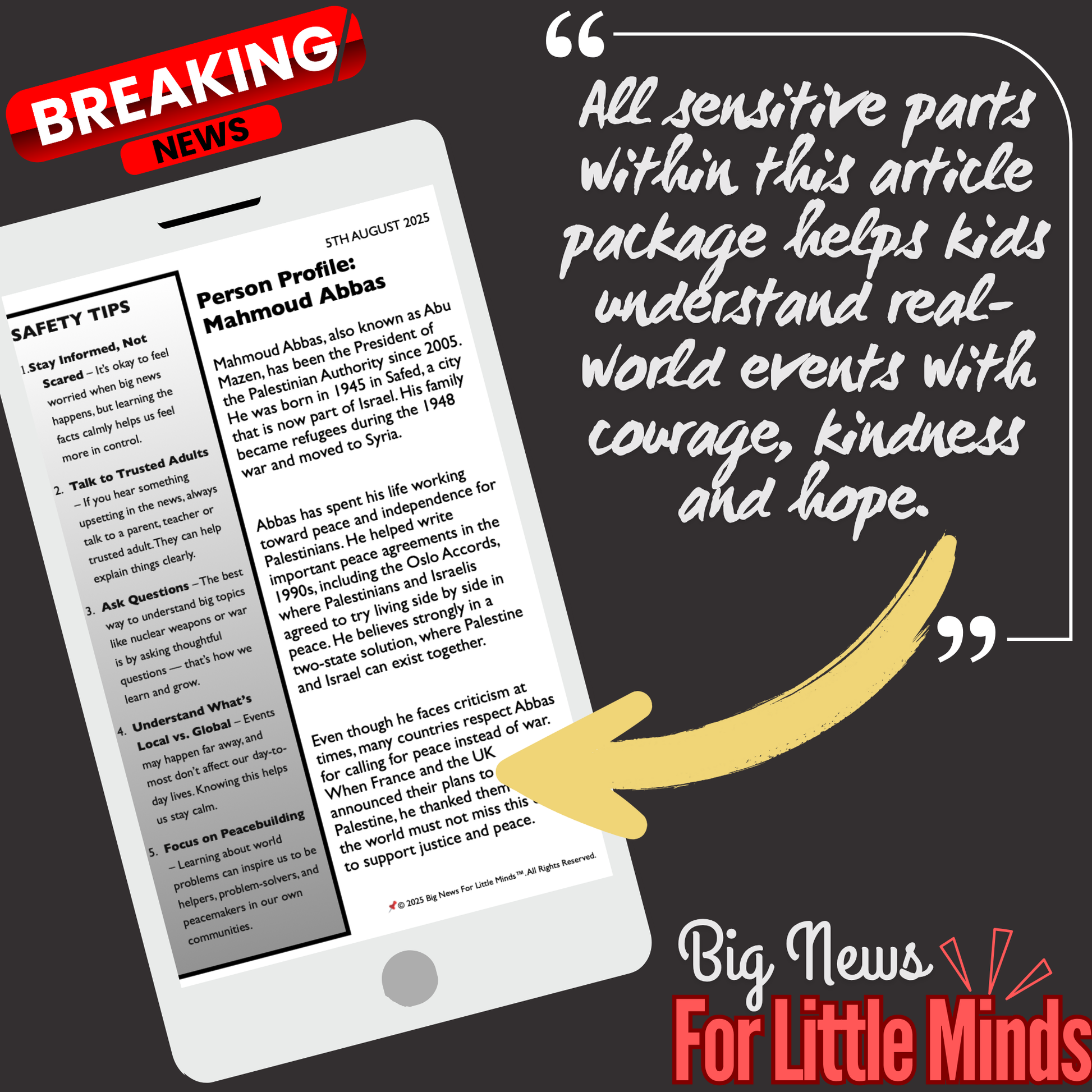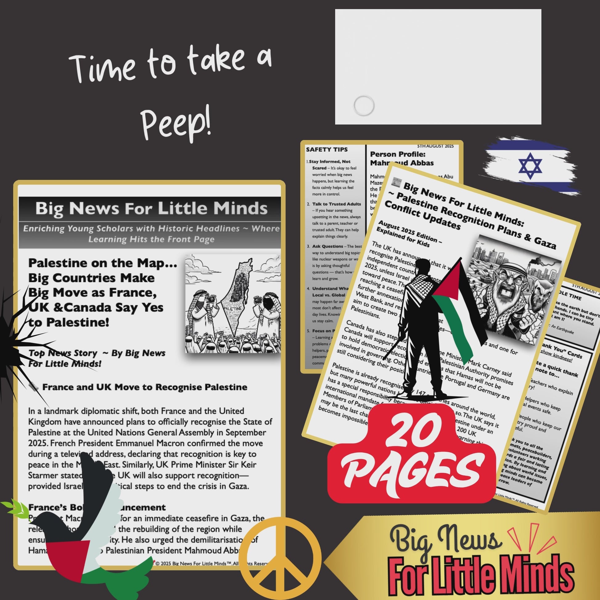 This detailed, child-friendly article package unpacks the historic moment when France and the UK announced plans to recognise the State of Palestine at the UN in 2025. Aimed at curious young minds aged 8+, this news sheet simplifies complex global issues into digestible, educational content. Students will explore diplomatic decisions, political reactions, and the idea of peaceful solutions through engaging sections like news summaries, quizz, activities, and discussion prompts.