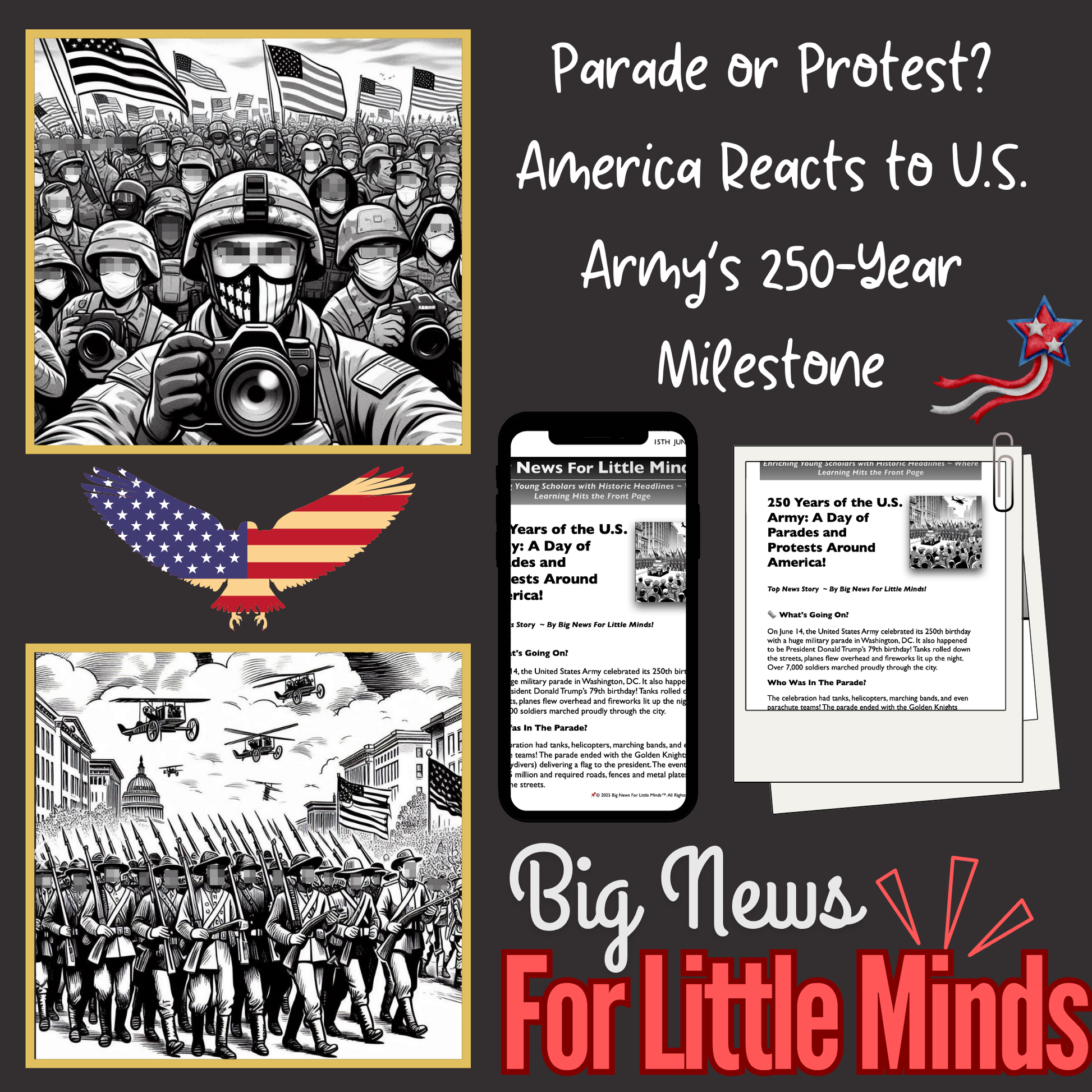 Bring the headlines to your classroom with this kid-friendly article about a major event in the U.S.—the Army’s 250th birthday parade and the nationwide protests that happened on the same day. From tanks and fireworks to signs and marches, this printable resource presents both celebration and civil protest in a balanced, factual way. Perfect for upper elementary and middle school students learning about democracy, history and the right to speak up.