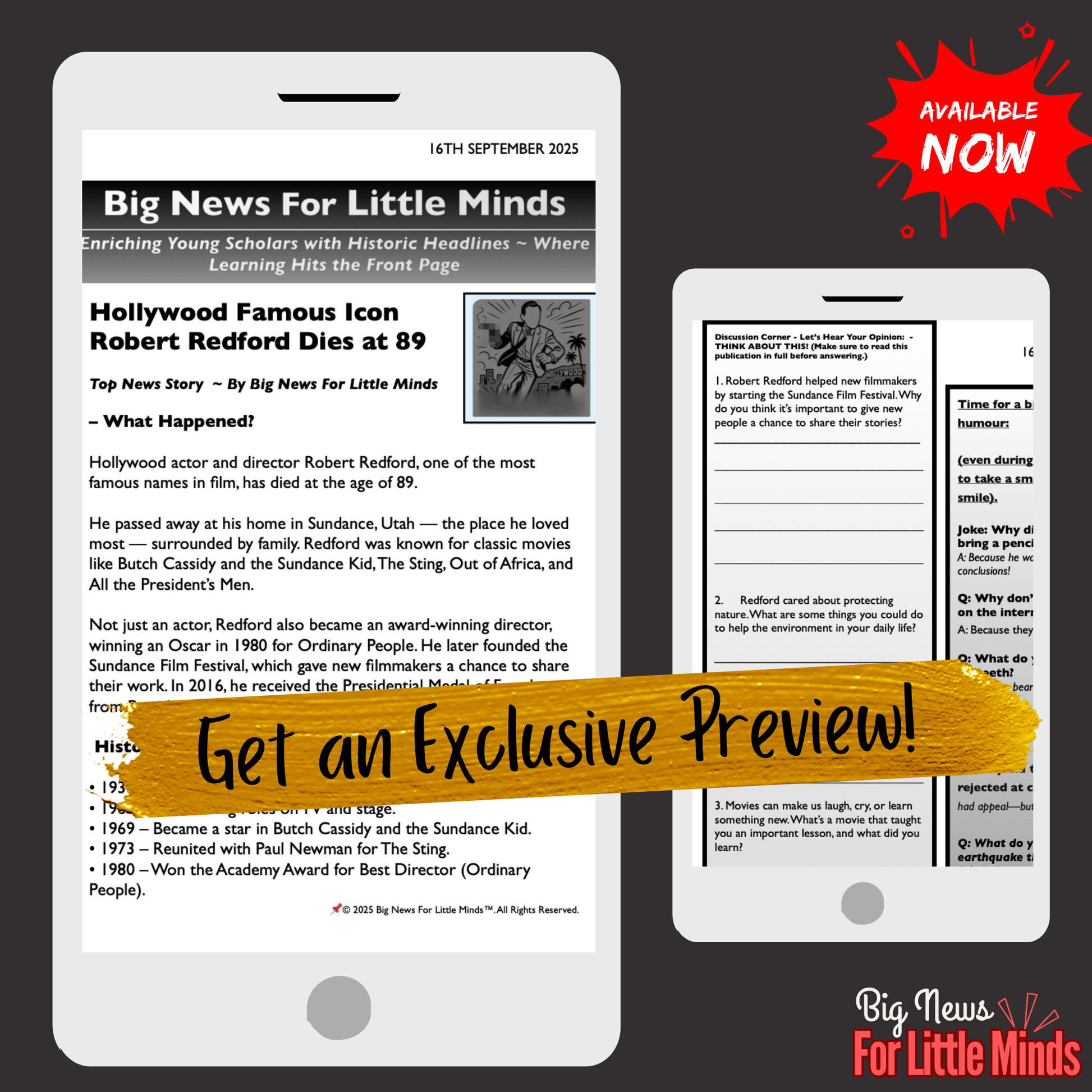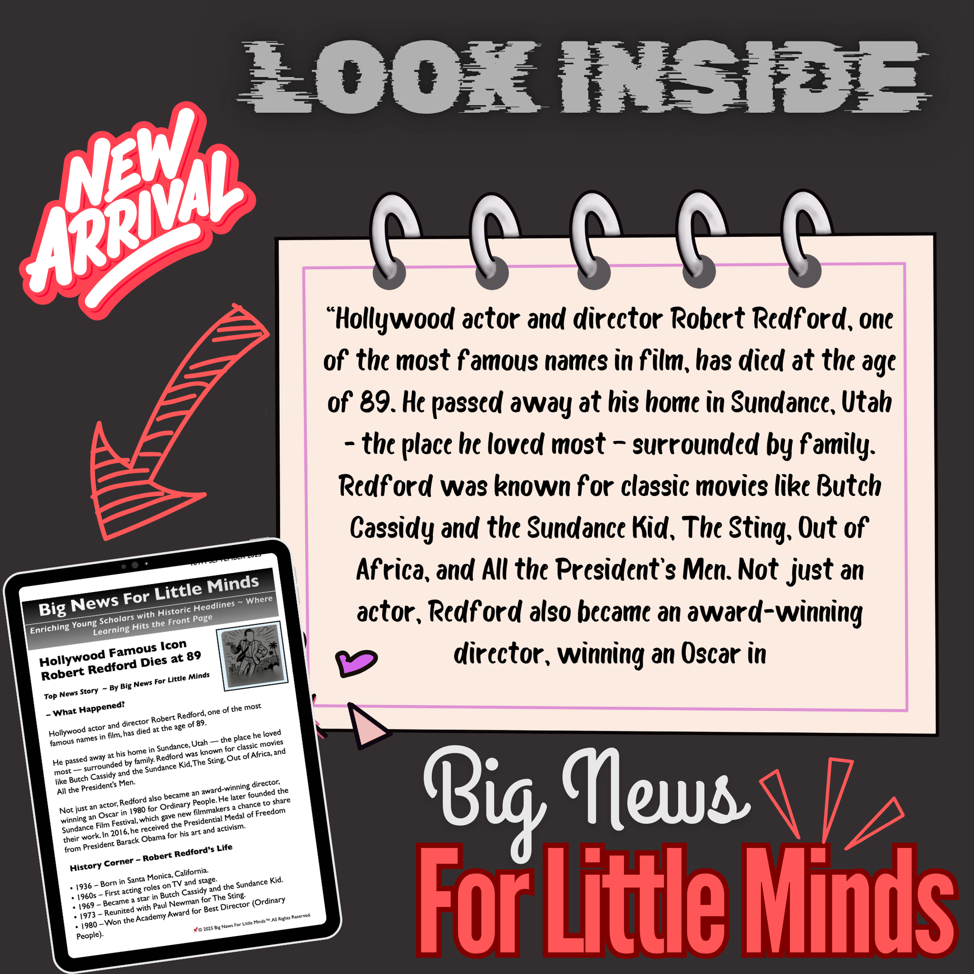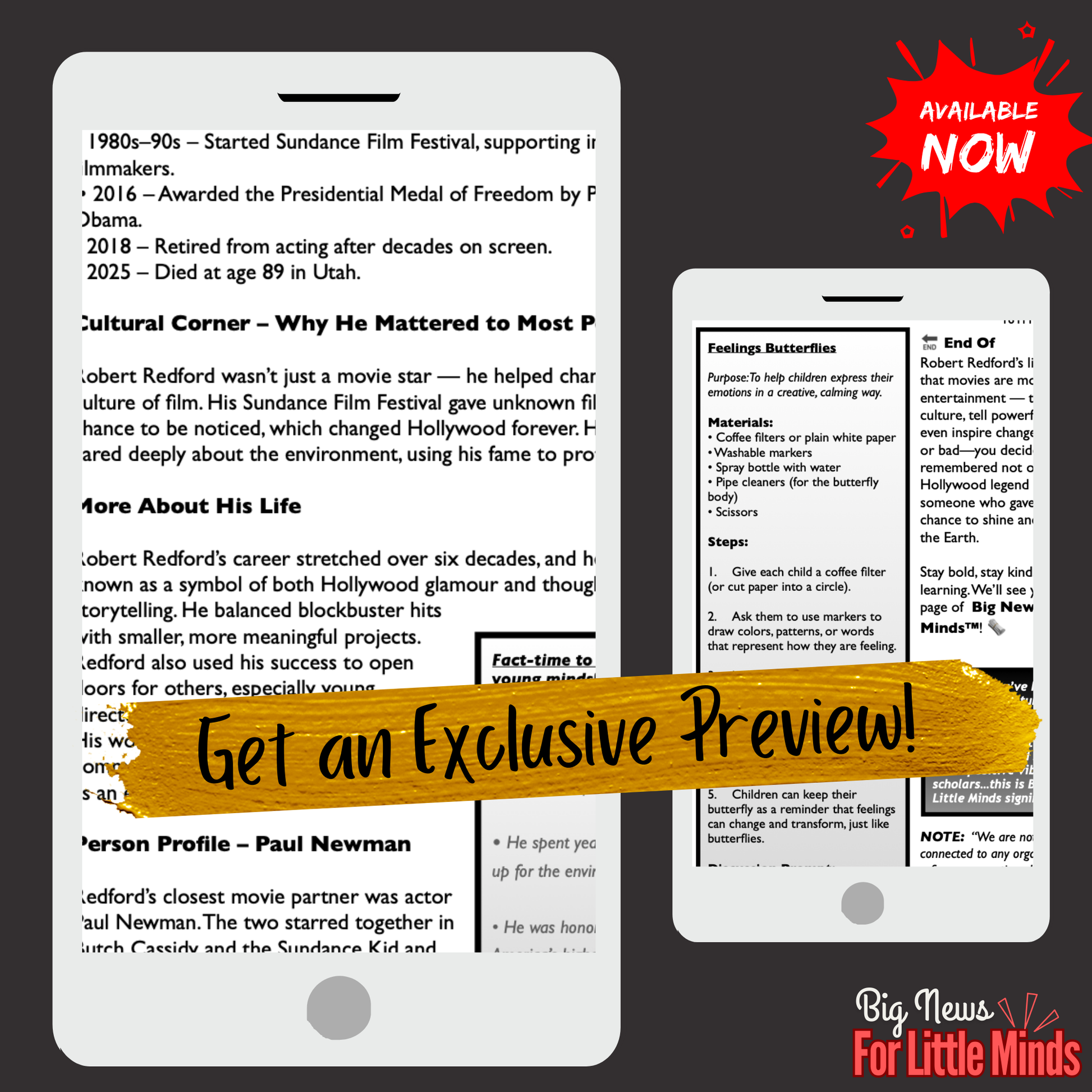 This article package introduces children aged 8+ to the life and legacy of Robert Redford, one of Hollywood’s greatest actors & directors, who passed away at age 89. Written in clear, engaging language (a grief activity based on feelings and a timeline history of this actor's life), it helps students explore his most famous films, his achievements as a director, and his role as the founder of the Sundance Film Festival. The resource also highlights his environmental activism and cultural influence, making it more than just a story of a movie star — it’s about a man who shaped the future of film and inspired change. (*Note: Tap Big News For Little Minds your shortcut to smart resources!)
