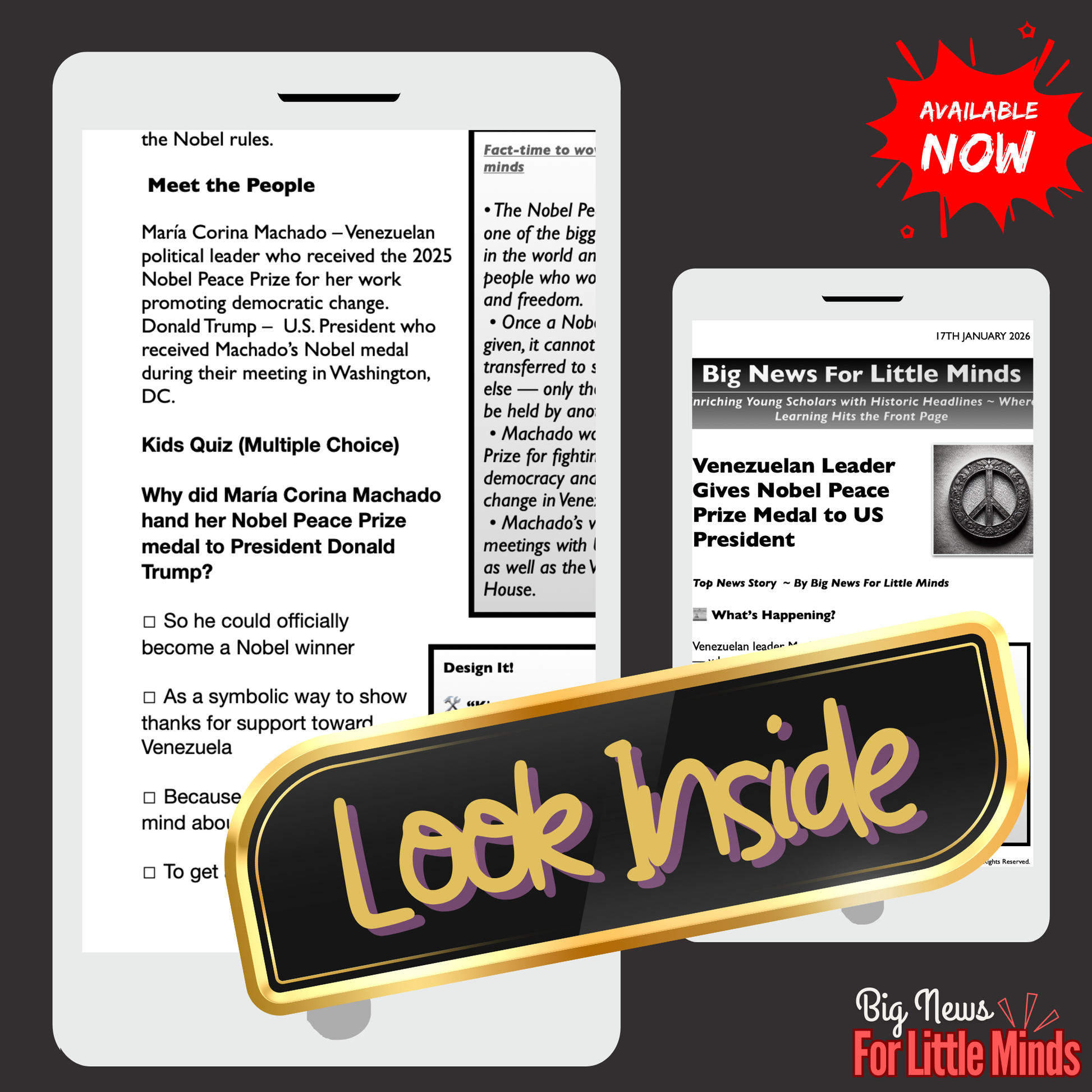 This clear, kid-friendly article package helps students understand a real-world political moment involving peace, democracy and symbolic gestures. Through simple explanations, key facts, and reflective activities, learners explore why Venezuelan leader María Corina Machado shared her Nobel Peace Prize medal with U.S. President Donald Trump — and what symbolism means in global leadership. Ready to teach, no prep, and ideal for upper elementary to middle school classrooms.