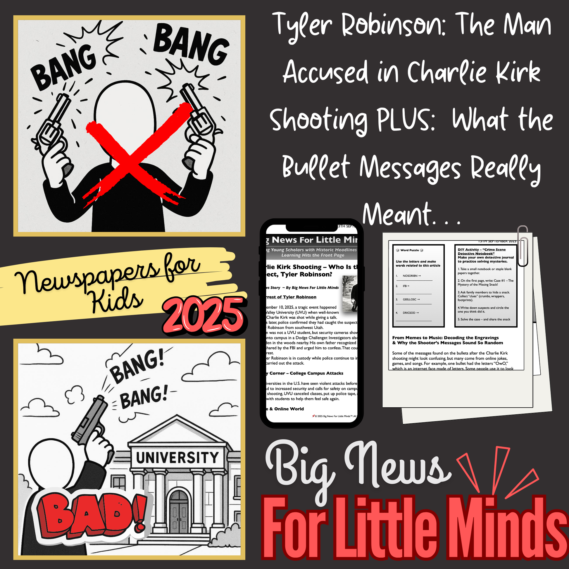 This article package introduces children aged 9-10+ to a serious real-world event—the shooting of political speaker Charlie Kirk on September 10, 2025, at Utah Valley University. Written in clear, accessible language, it explains how the suspect, Tyler Robinson, was identified and arrested just two days later. The resource carefully covers what happened, how the investigation unfolded, and the role of family, technology, and community in solving the case. Alongside the main story, children can explore history, culture, person profile, puzzle, and activities that help them think critically while learning.