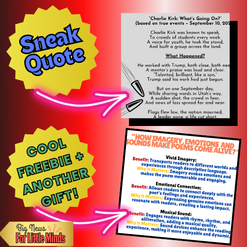 This concise poetry package helps students understand the life and legacy of Charlie Kirk, as well as the tragic events of September 10, 2025. Written in clear, age-appropriate language for children aged 7+, it introduces a figure who inspired young people in politics and leadership while addressing the importance of peace and non-violence. (Resource includes a brief poem alongside two freebies, one of which is a worksheet, gifted from us at: Big News For Little Minds!)